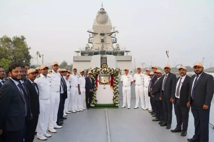Taragiri, named after Uttarakhand’s Taragiri hills and reviving a legacy Leander-class frigate (1980-2013), spans 149 meters, displaces 6,670 tonnes, and uses CODOG propulsion for speeds over 28 knots. Built in 81 months using integrated modular methods—shorter than the lead ship’s 93 months—it boasts 75-95% indigenous content, including DMR 249A steel for enhanced stealth via low radar signature.