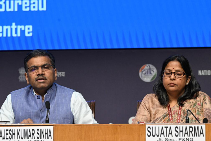 Rajesh Kumar Sinha, Special Secretary, Shipping and Waterways Ministry, and Sujata Sharma, Joint Secretary, Petroleum & Natural Gas Ministry, (right) addressing the media